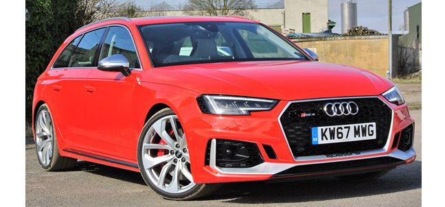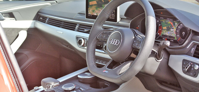 The latest RS4 takes a well-trodden path to its on-street presence. Blistered wheel-arches covering optional 20-inch forged (not cast) light alloy wheels – 19.0-diameter versions are standard – and appropriately ultra-low-profile tyres are immediate identifiers. Yet, peer a little closer and you spot the drainpipe dimension, twin exhaust tail-pipes and neat little air-vents at the lamp unit extremities fore and aft, the dinner-plate sized, ventilated brake discs, complete with red-painted RS callipers, and the utterly lovely, honeycomb pattern, light grey Nappa hide sports seats. Nothing is wasted. Nothing is excessive. It all seems to be just right for the RS4 driver.