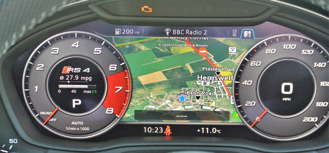 However, the figures belie the utterly visceral experience that results from flooring the throttle on the first open road opportunity. Kicking-down the 8-speed automatic transmission produces an initial bass response from the engine, which soon blends into a higher-pitched ‘yowl’ with each fast-approaching red-line shift up the ratios, every millisecond precise gearchange producing a flat ‘blart’ from the over-fuelled exhaust. It is exciting and almost matched by the shock of despatching the 0-60mph benchmark dash in a mere 3.7s, before the RS4 courses upwards to its re-programmed (but limited) maximum velocity of 174mph…the same as the RS5, although I have no way to confirm it in the UK. Incidentally, I recorded a satisfying 30.8mpg driving between Lincoln and Lutterworth, which compares very favourably with a posted 32.1mpg Official Combined return riding on the big wheels.