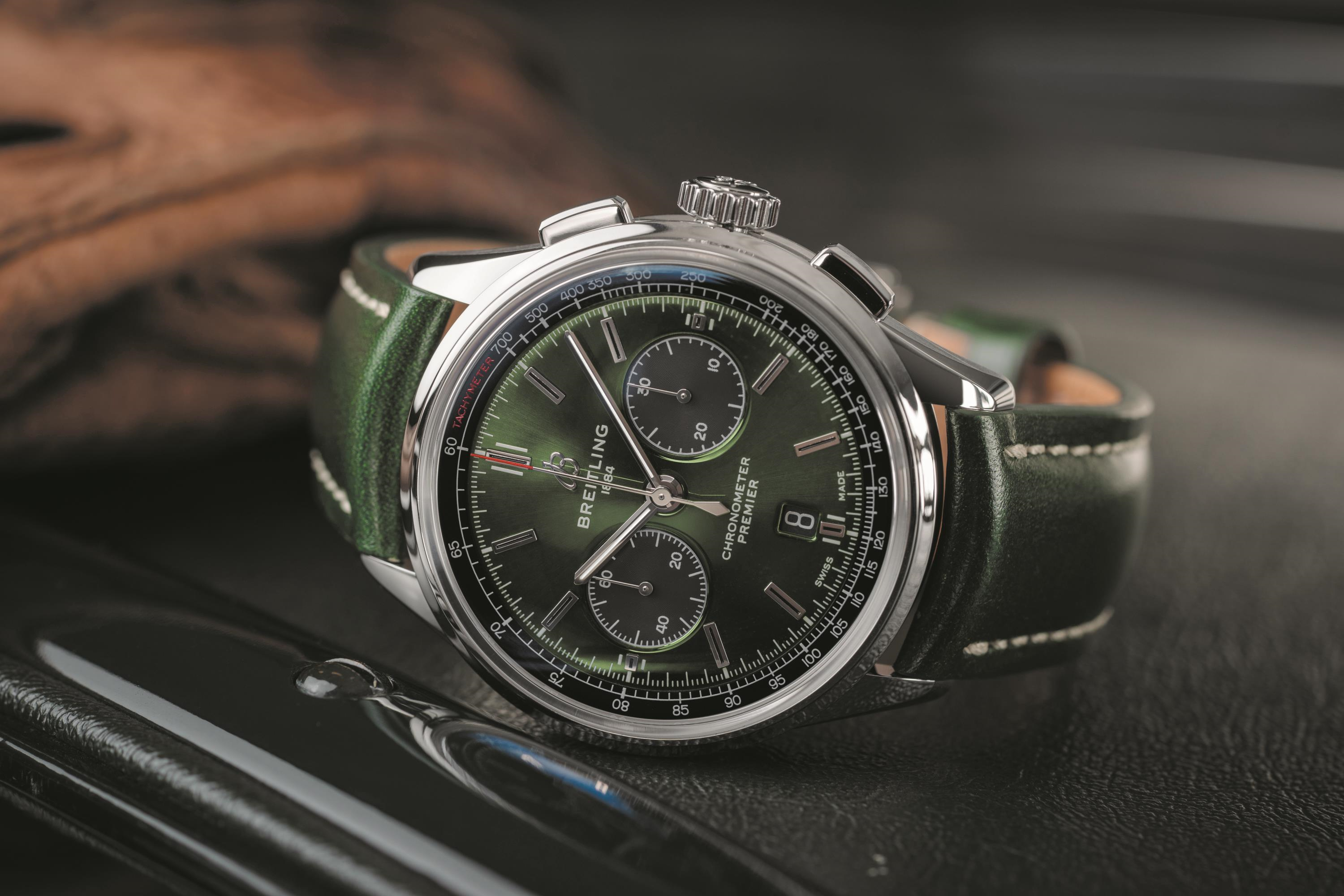 The watch is distinguished by its striking British Racing Green dial and is available with a choice of a stainless-steel bracelet, or a British Racing Green leather strap that matches the dial. Contrasting sub-dials are positioned at 3 and 9 o’clock, and a date window is located at 6 o’clock.