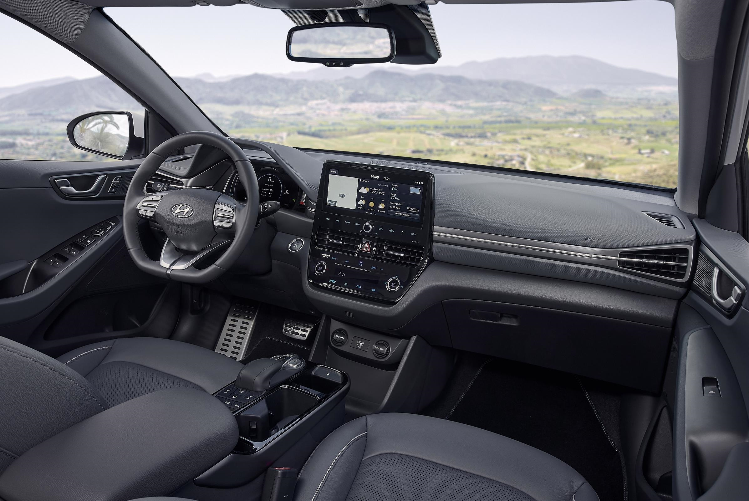 Below the new wide screen 10.25-inch monitor, the control panel for heating and climate control has been redesigned and sports a glossy finish. New touch-type controls allow for accurate operation of heating, ventilation and air conditioning. The Ioniq Electric standard high-resolution 7.0-inch LCD console display (also available on hybrid and plug-in hybrid range, albeit on the higher trim versions) has been improved with mood lighting to visualise the different drive mode themes. To round off the improved modern interior design, blue ambient lighting has been applied across the passenger-side lower dashboard and the centre console.