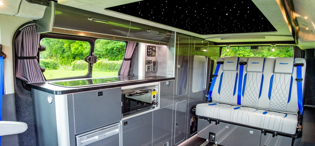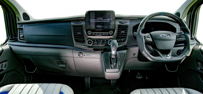 With the interior fitout being handled by Wellhouse, Steve approached QVM-accredited partner MS-RT to providing some serious visual style. MS-RT’s new Transit Custom package was adapted for the campervan specification, with a full body kit and anthracite 18.0-inch diameter OZ alloy wheels backed up by a twin exhaust system and some bold graphics. Inside, the Wellhouse seating package was given a stylish MS-RT white leather finish with contrasting blue panels and stitching carried onto the seat belts.