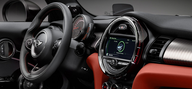 So what do you get for the JCW variant's premium? Well, inside the cabin there are John Cooper Works sports seats with integrated headrests and upholstery in Dinamica/fabric. Other standard fittings include John Cooper Works branding for the leather steering wheel, the door sill cover strips and the gear lever, plus stainless steel pedals and cockpit displays with dark dials. Interior trim in a Black Chequered pattern with red design accentuations appears not only on the seat surfaces but also on the steering wheel rim, the gear lever and the central instrument surround.