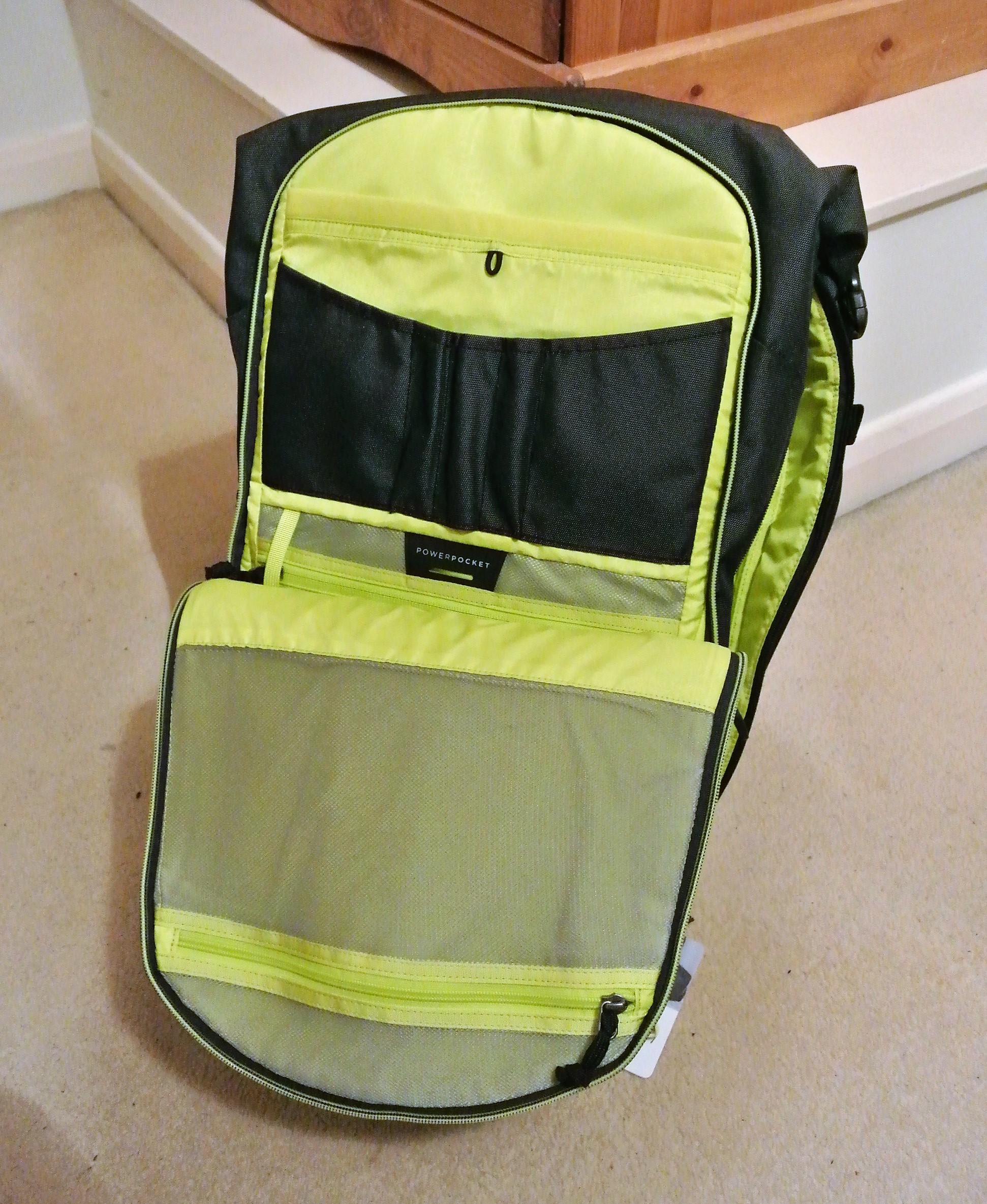 Its long list of product benefits matches my requirements to perfection. For a start, it features a well-padded internal organiser for pens, lap-top and documentation. There is even a ‘PowerPocket’ for cords, leads and plugs and an accessible key-holder that is useful for long-term parking. Thanks to a removable ‘packing cube’, I can stash shoes and dirty laundry in a separate, zipper-lined compartment. A convenient zippered side entrance allows ready access to internal contents and an expandable side pocket allows a water-bottle and other personal items to be reached easily.