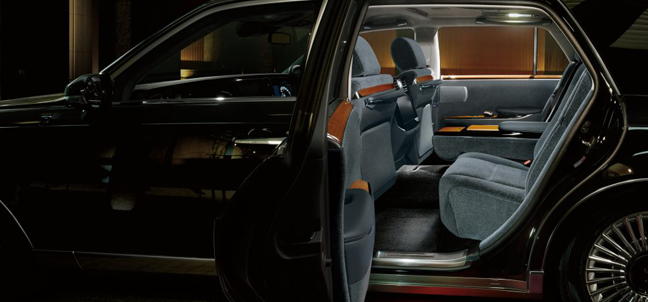 Ease of access was a priority for the Century and its rear cabin features wood trim and a raised ceiling design with an exclusive fabric headlining that contains a slanting lattice motif, a traditional manji design representing perpetual prosperity for the home and longevity. The nearside rear seat has an electrically extending leg rest and an integrated massage system and there is a rear seat entertainment system, with an 11.3-inch monitor, 12-channel audio amplifier and an array of 20 speakers. A seven-inch touchpad in the centre armrest gives easy control of the audio system, air conditioning, seat massage function and the rear privacy curtains.