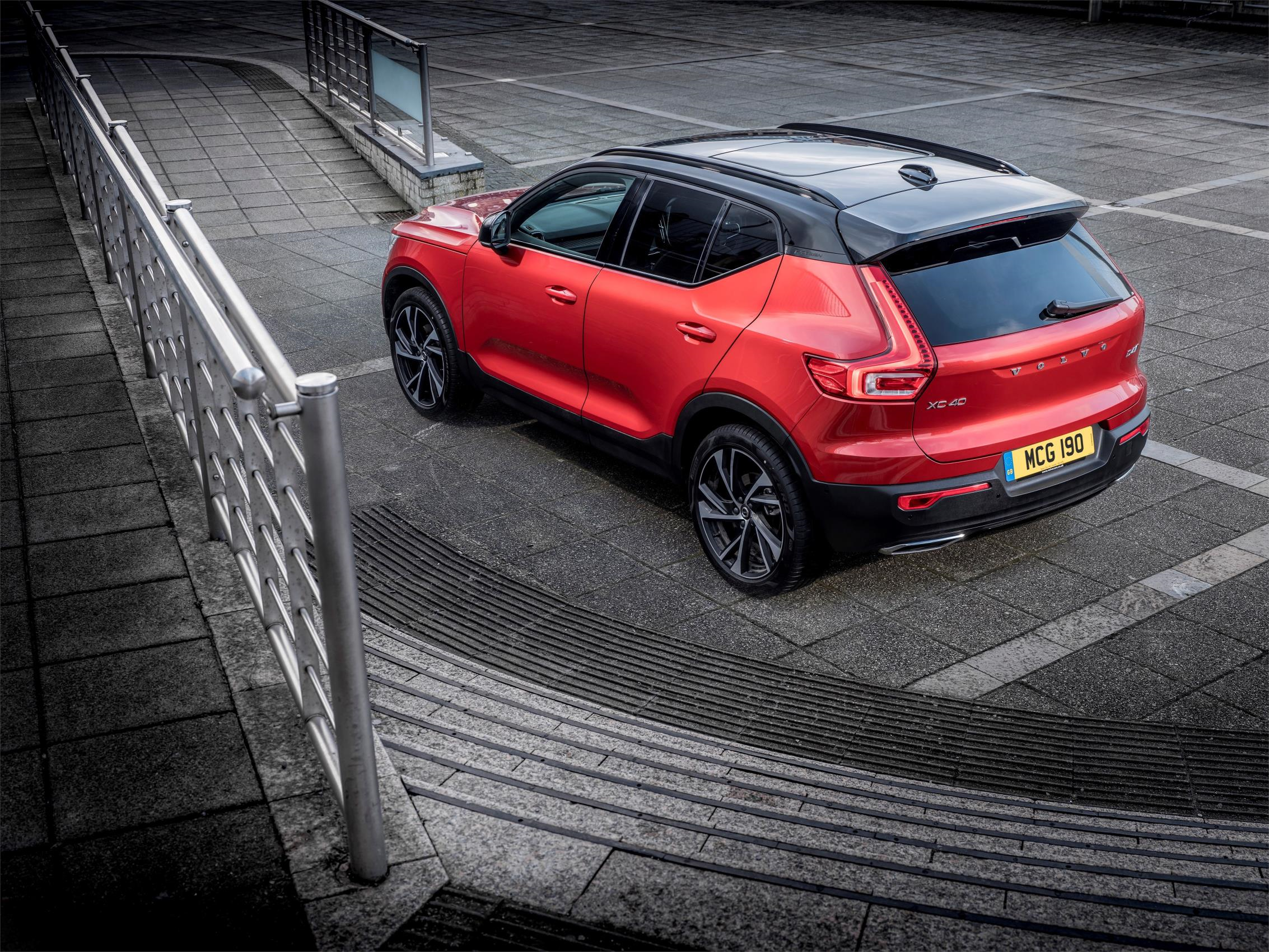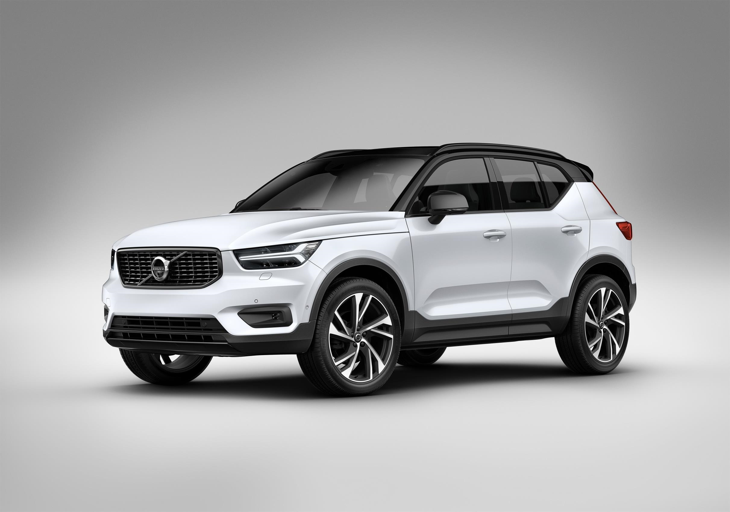 R-Design models are distinguished by exterior detailing, such as Black Stone roof panel and door mirrors, high-gloss black grille, front and rear skid plates, roof rails and window frames, dark-tinted rear windows, integrated dual tailpipes and alloy wheels with a striking diamond-cut and matt-black finish. The sporty theme is continued within the car, with R-Design tread-plates, black headlining, sports pedals and a perforated leather wrapping for the steering wheel and gear-knob. Equipment features include leather and Nubuck upholstery, front seat cushion extensions and LED front fog-lights. The R-Design also gets more dynamic suspension settings than other XC40s, including stiffer springs, thicker anti-roll bars and faster-reaction rear shock absorbers.